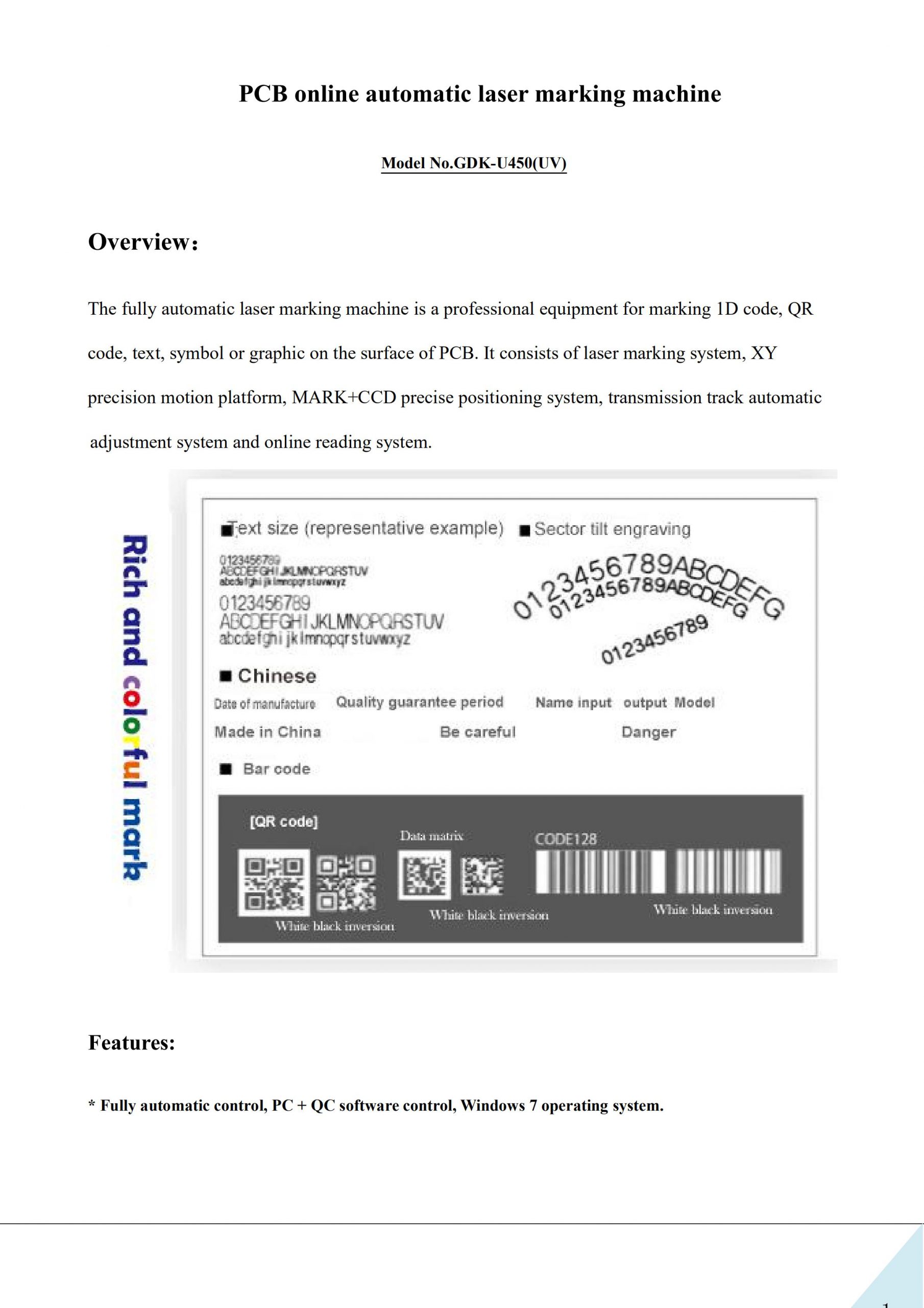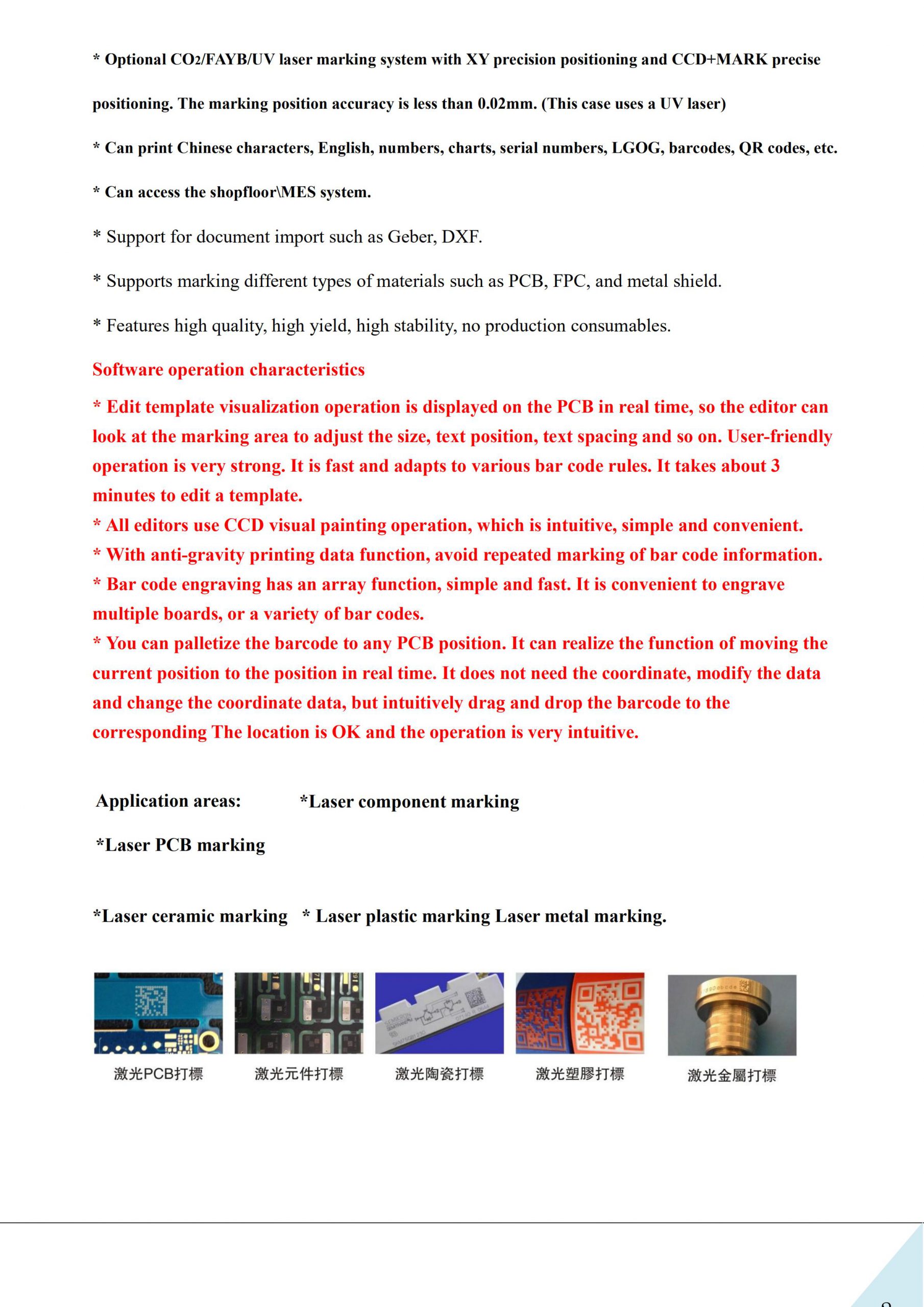 The fully automatic laser marking machine is a professional equipment for marking 1D code, QR code, text, symbol or graphic on the surface of PCB. It consists of laser marking system, XY precision motion platform, MARK+CCD precise positioning system, transmission track automatic adjustment system and online reading system.